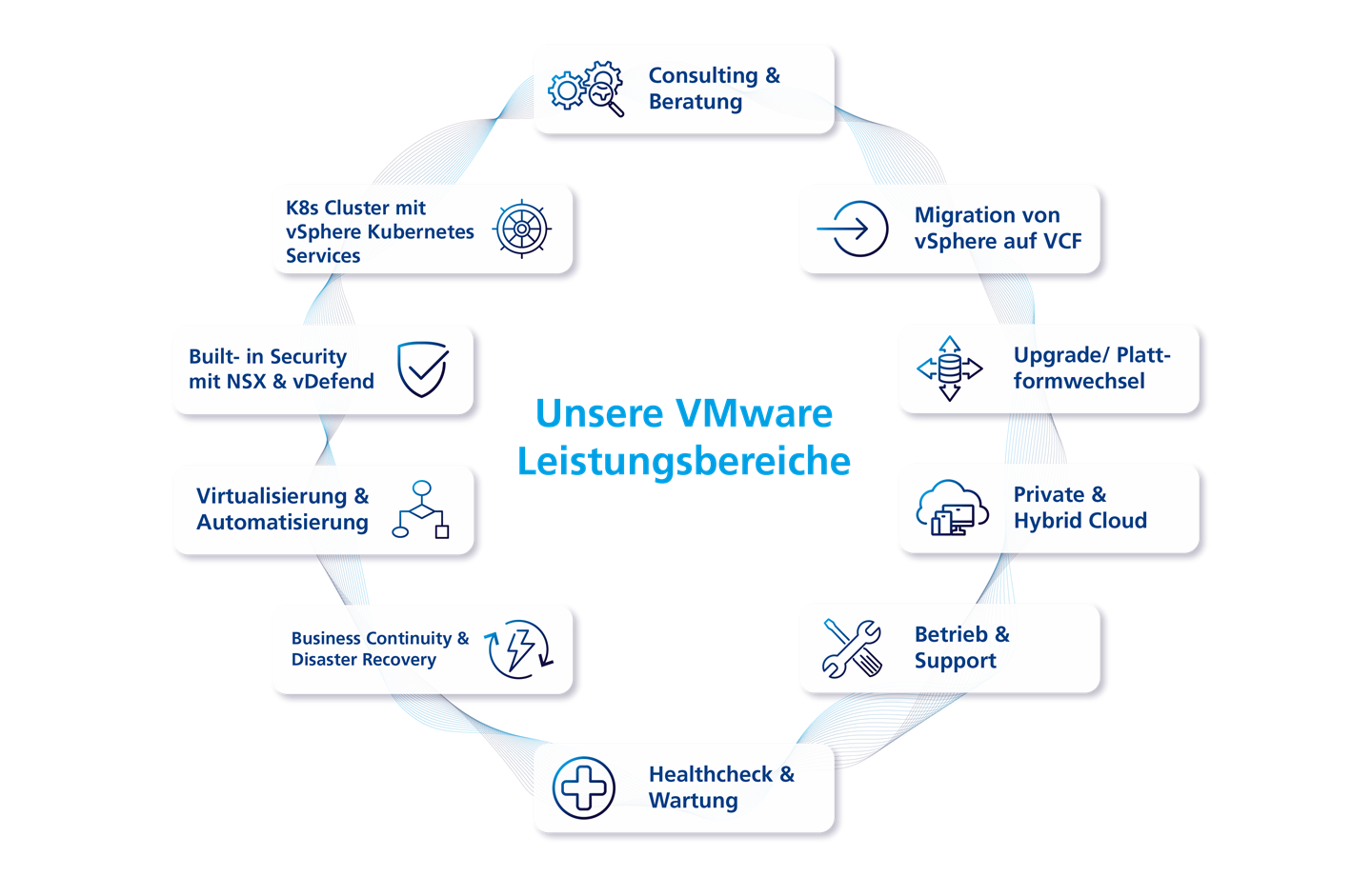 Mit einer Kombination aus Workshops und IT-Infrastruktur-Analyse bieten wir einen VMware-Healthcheck an. Unsere zertifizierten Consultants geben Ihnen individuell Empfehlungen zur Steigerung von Performance oder dem Beibehalten einer gewissen Stabilität und Verfügbarkeit.