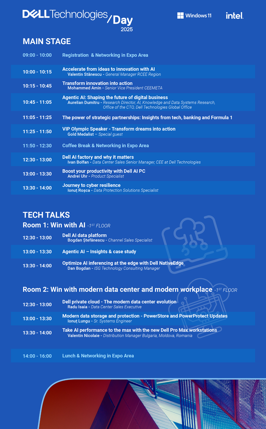 În calitate de partener Dell Technologies, te invităm la Dell Technologies Day 2025 pentru a descoperi cele mai noi tendințe în AI, multi-cloud și securitate cibernetică, precum și soluții inovatoare capabile să accelereze transformarea organizației tale în era AI.